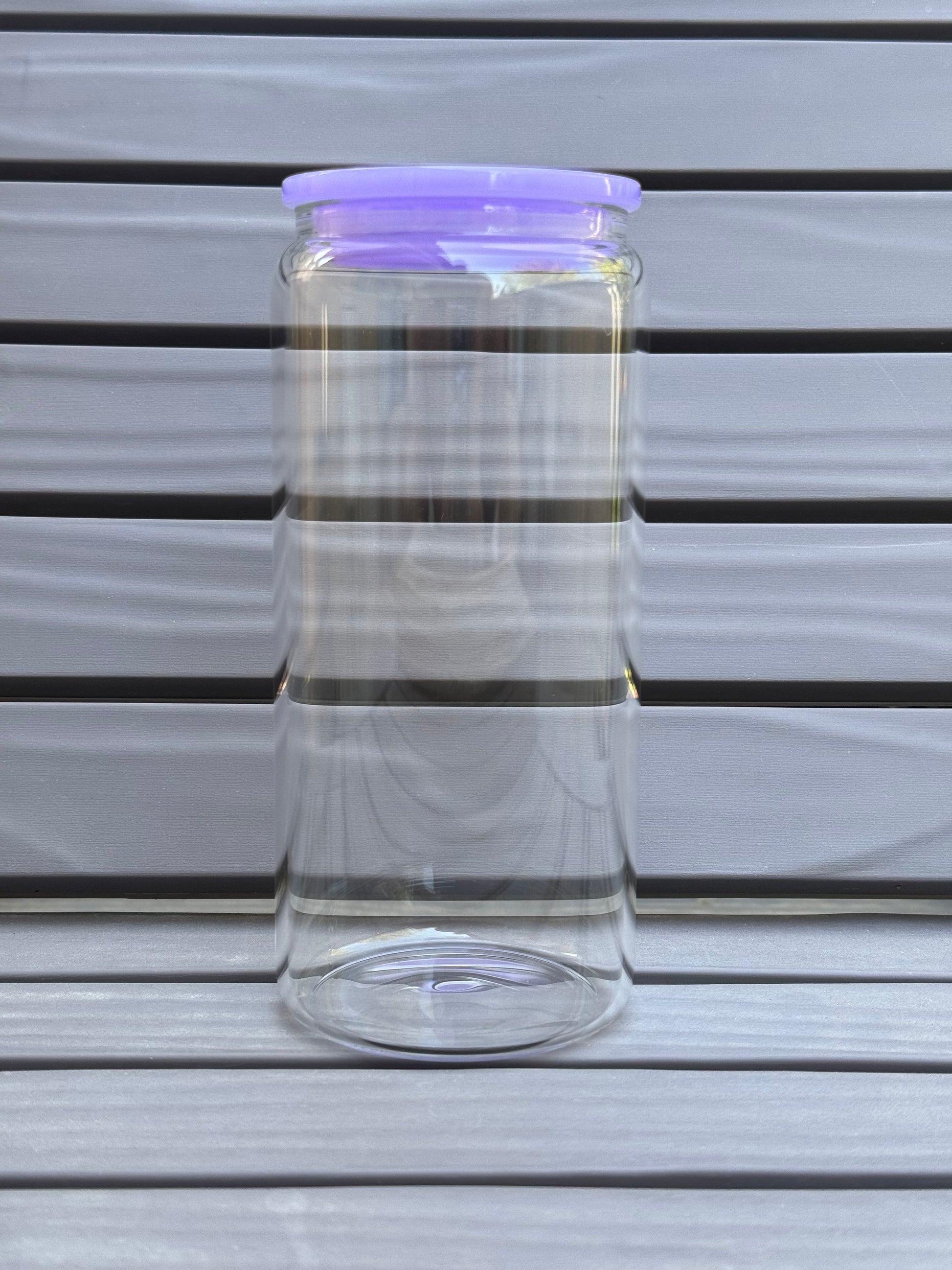 20 oz. glass cup, comes with purple plastic lid and reusable glass straw.