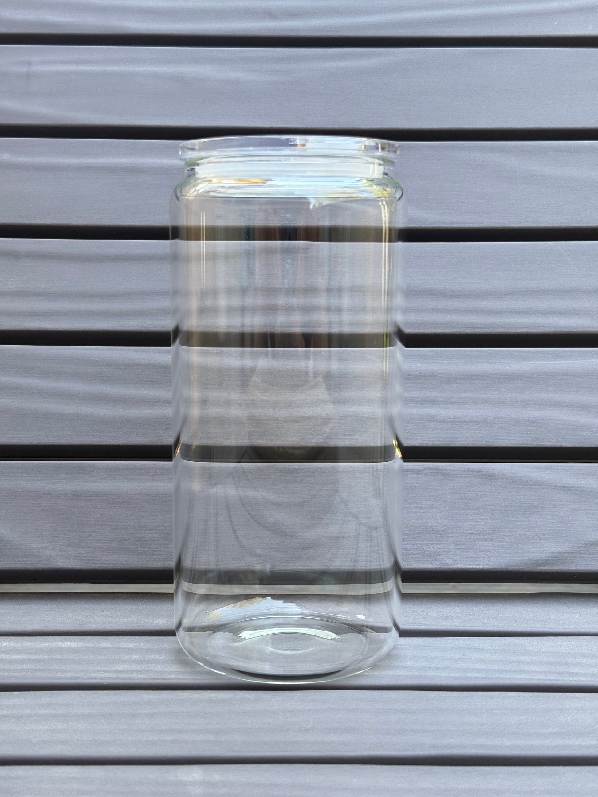 20 oz. glass cup, comes with clear plastic lid and reusable glass straw.