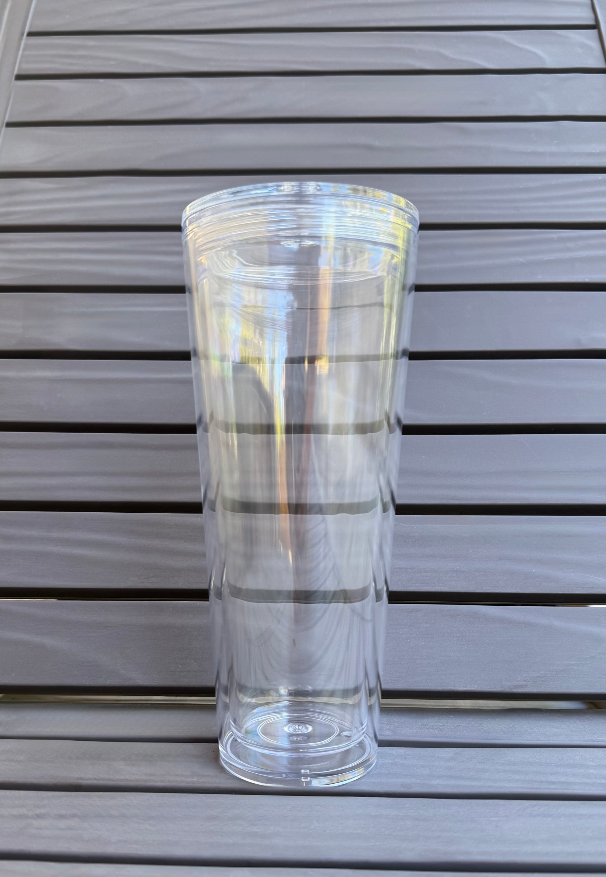 This is a tall 24 oz. acrylic snowglobe tumbler, comes with a clear lid and a reusable plastic straw.