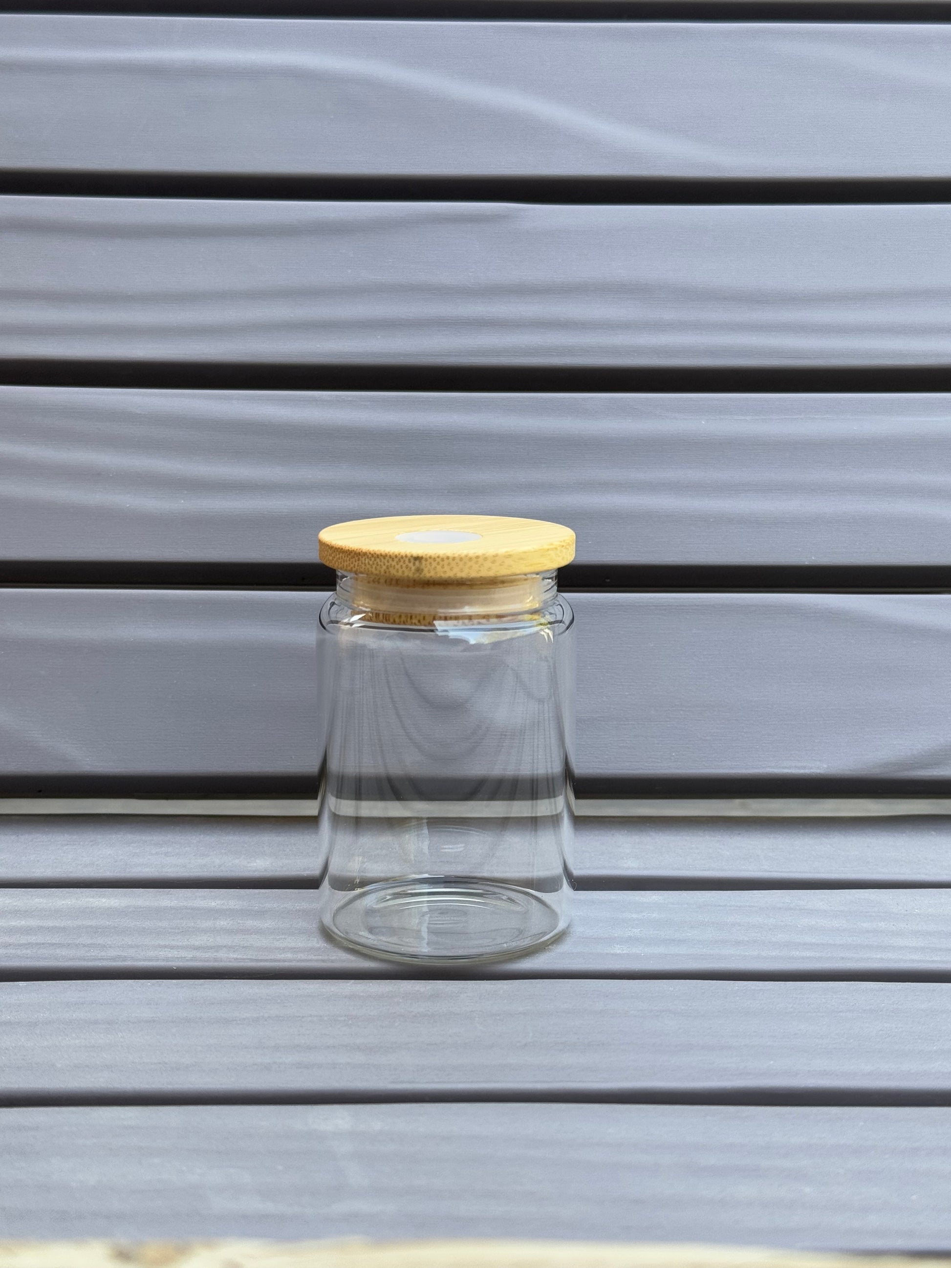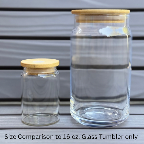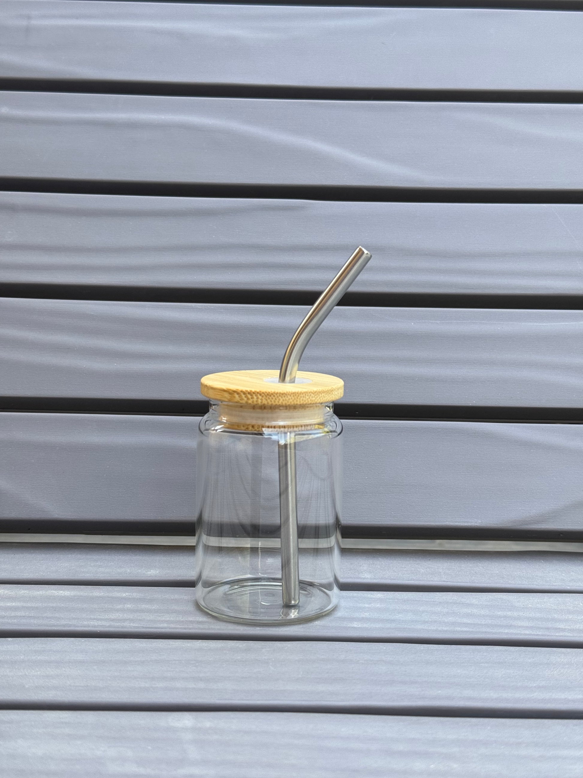 3 oz. Glass tumbler, comes with bamboo lid and stainless steel straw.