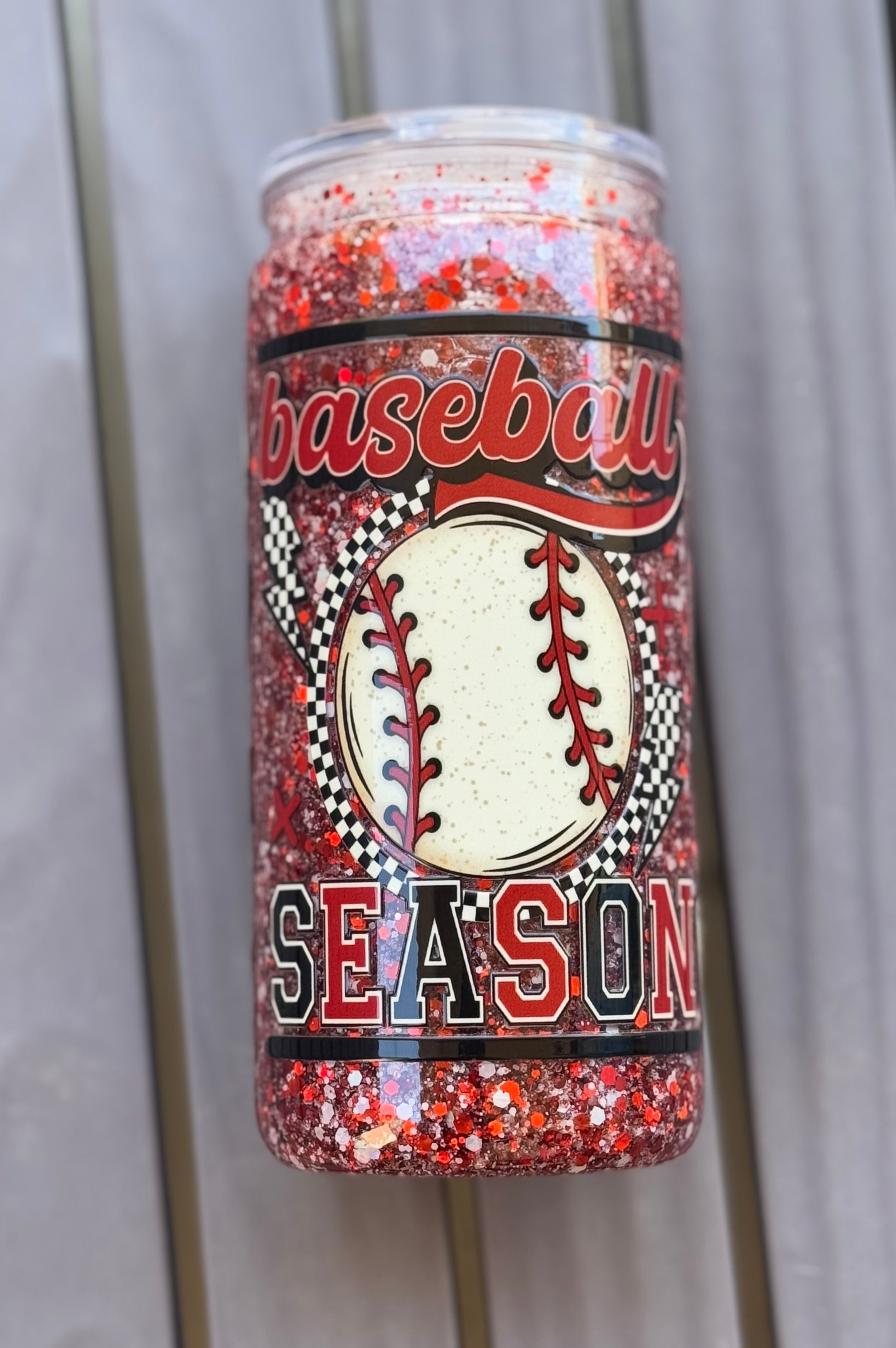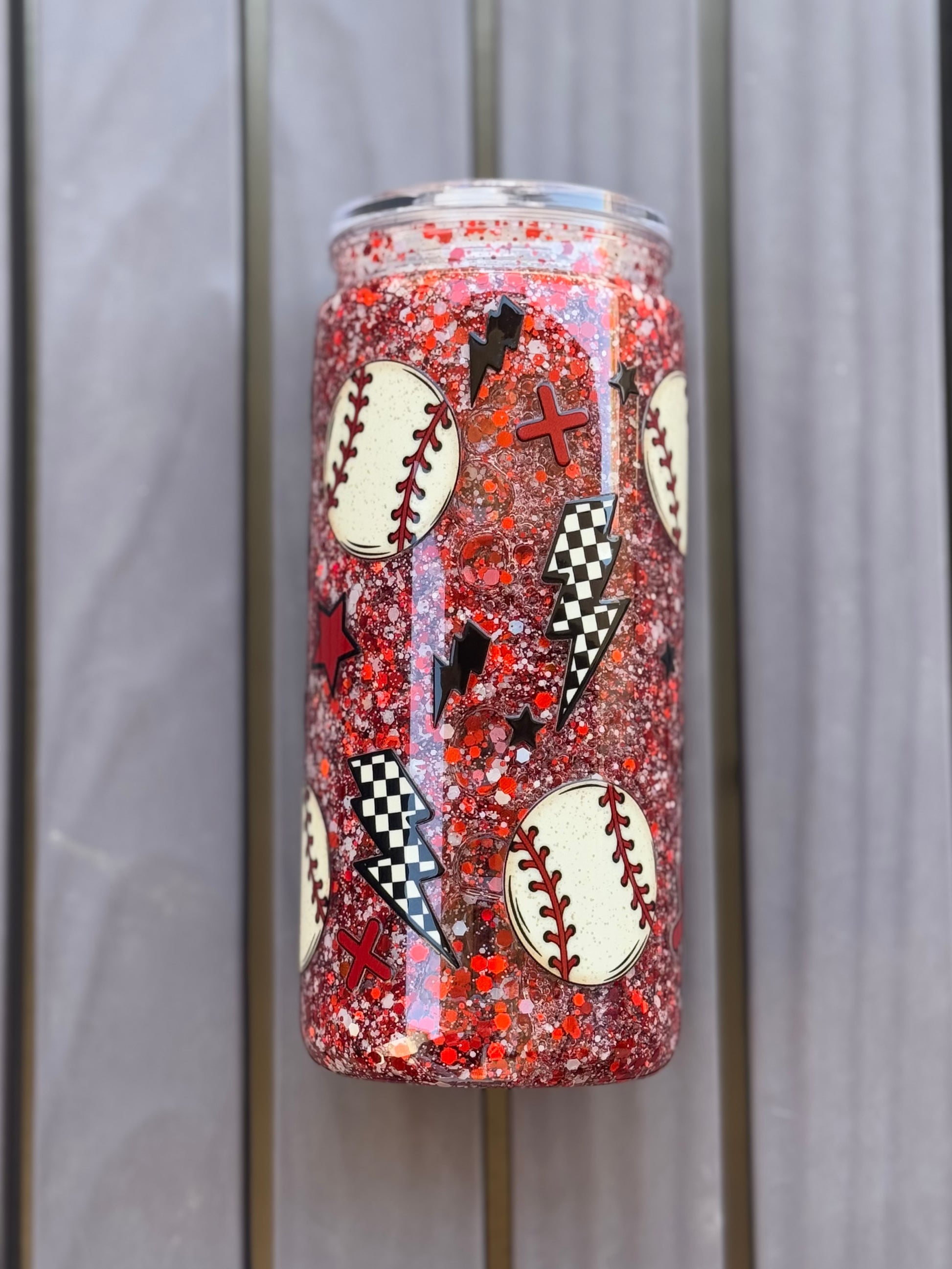 20 oz acrylic snow globe cup with red and white glitter, slow flow. Comes with a clear plastic lid and plastic straw.