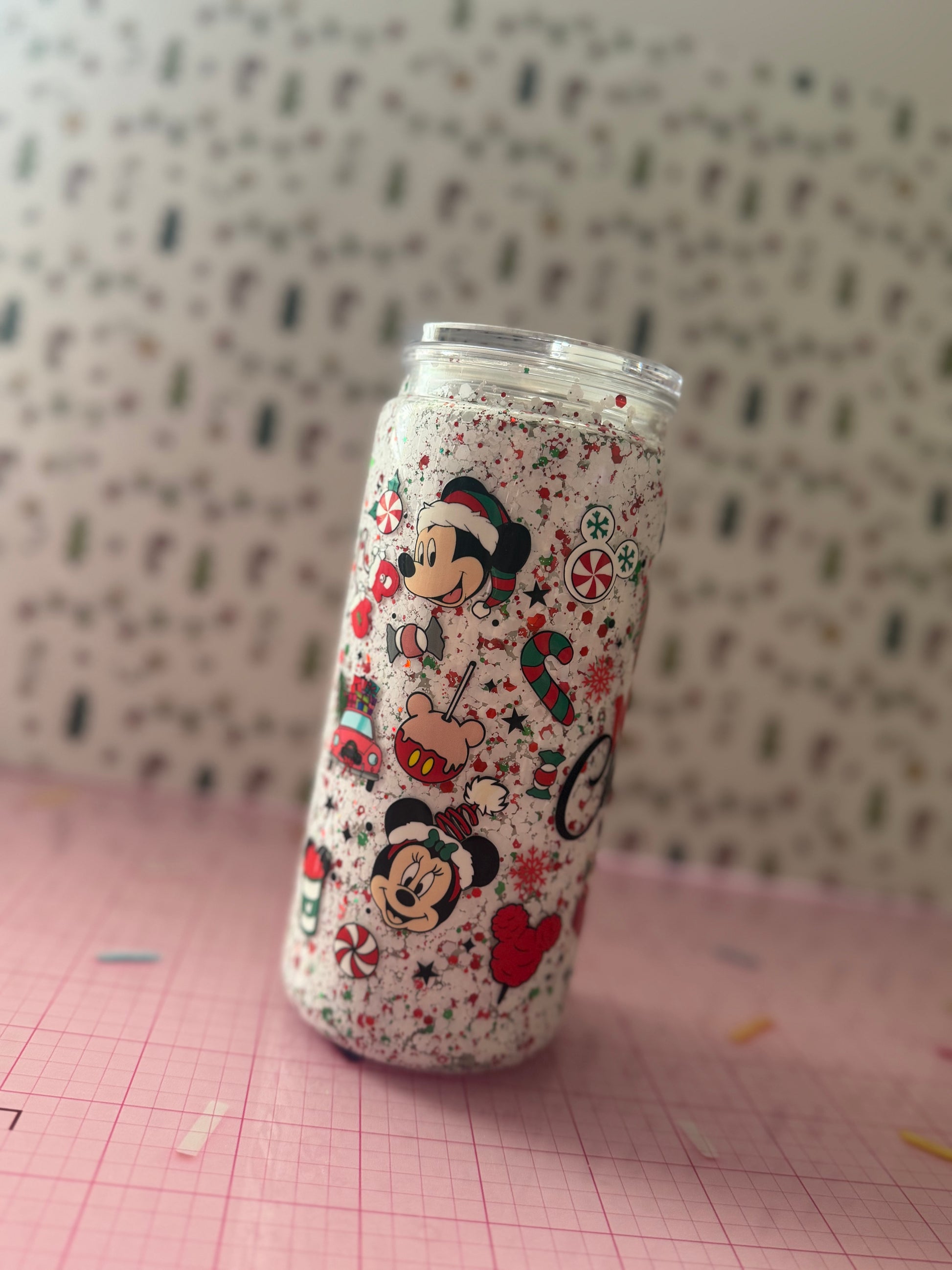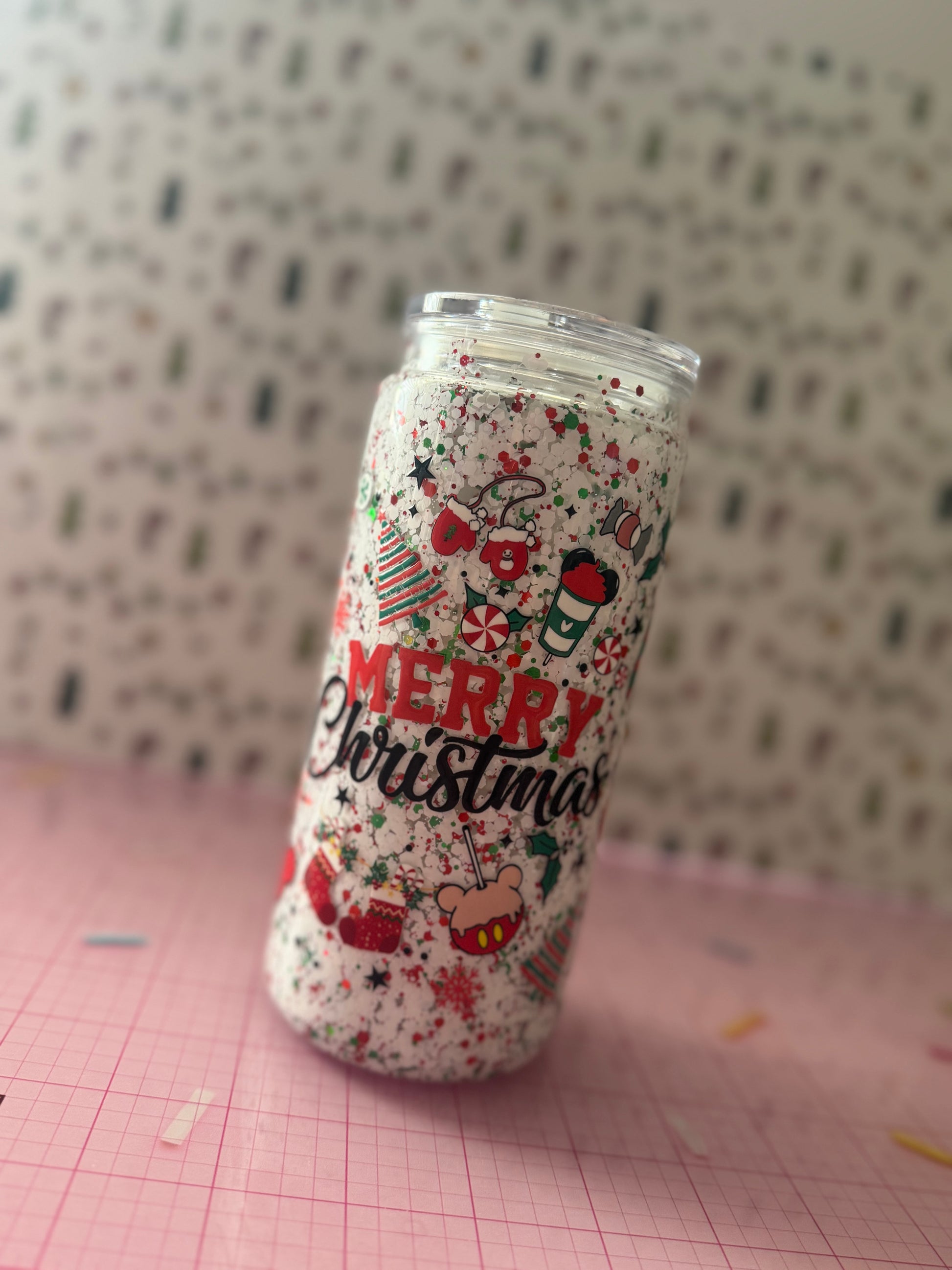 This is a 20 oz. acrylic dry snowglobe cup, comes with a clear lid and reusable plastic straw. Glitter is mainly white with hints of red and green.