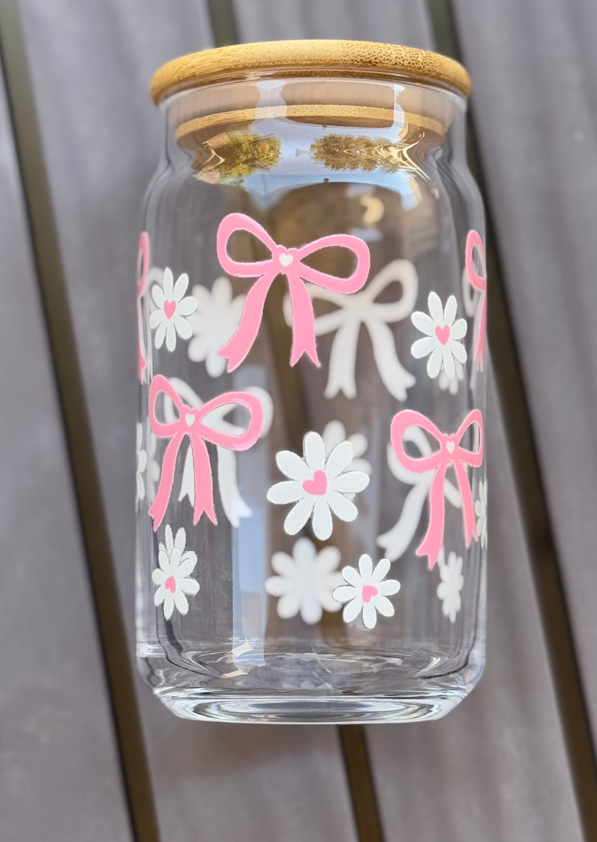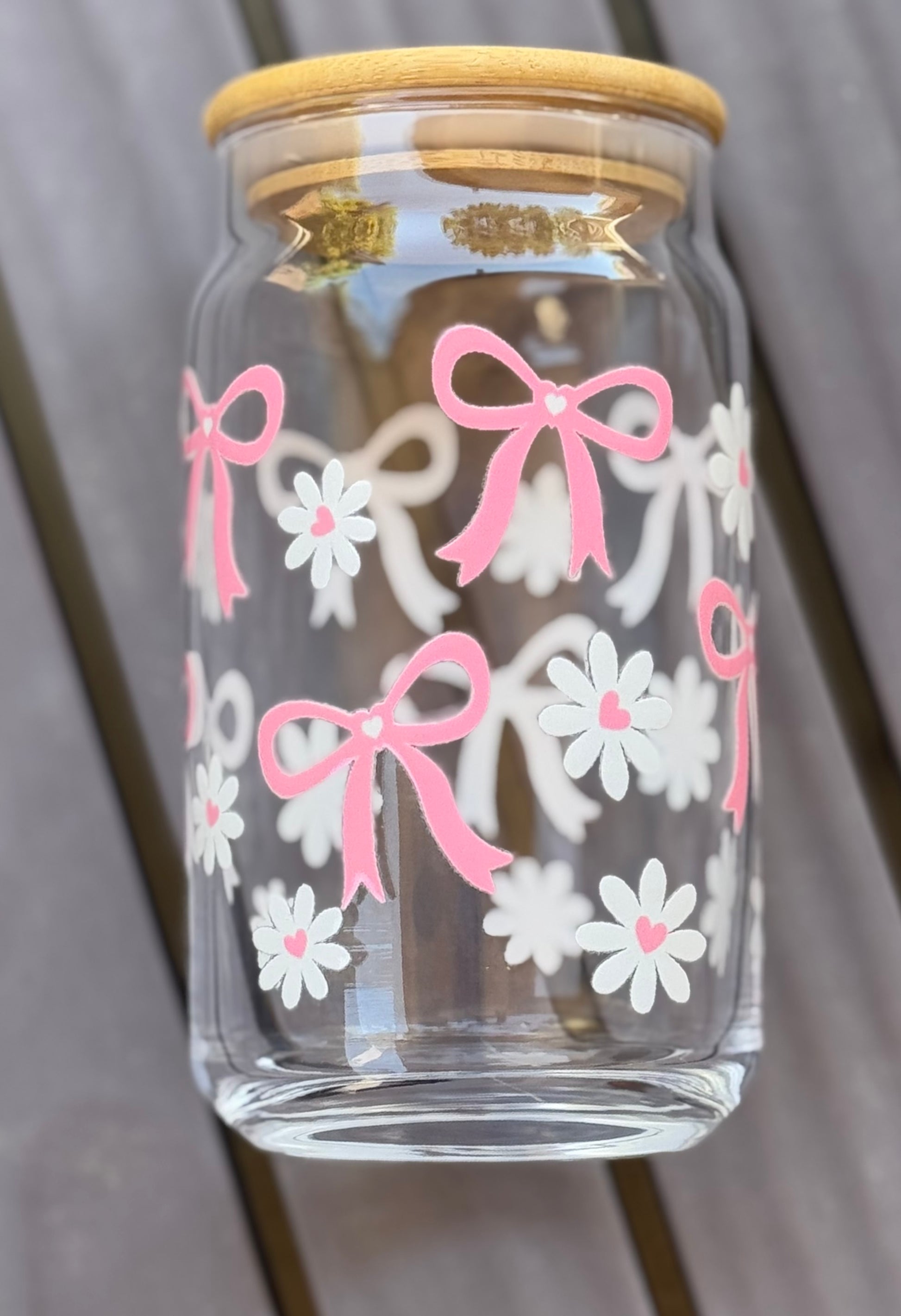 16 oz glass cup, comes with bamboo lid and reusable glass straw.