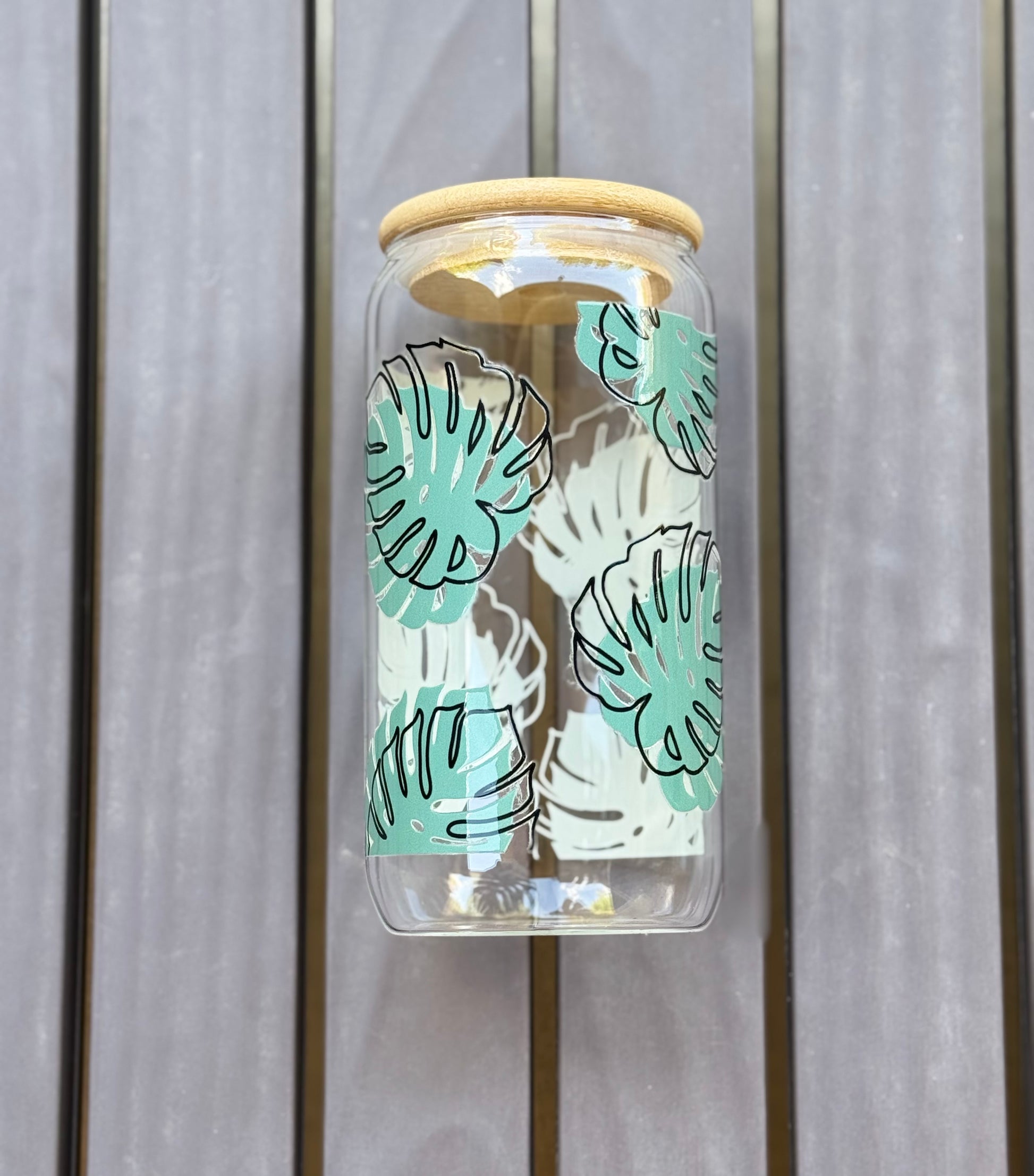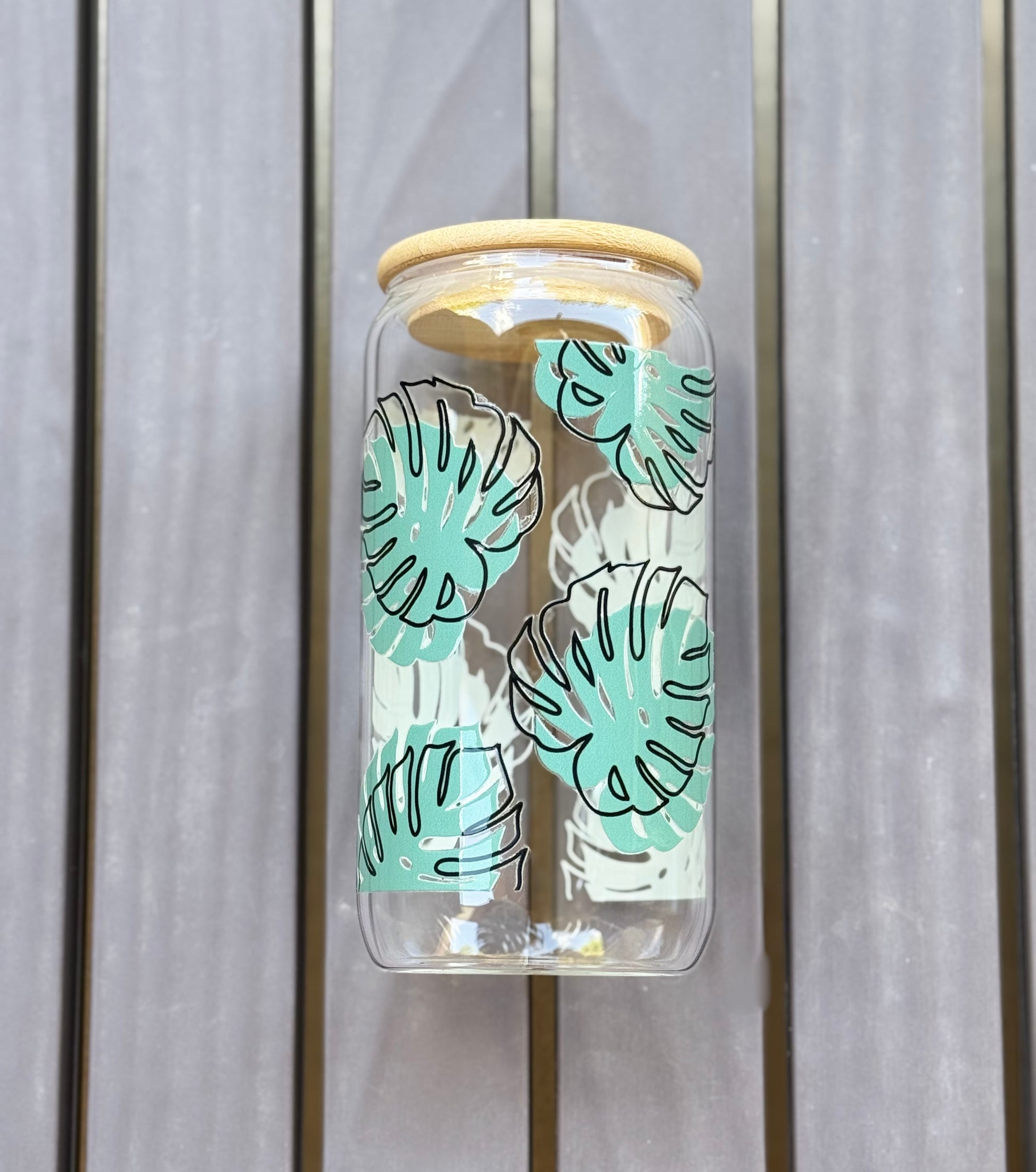 16 oz glass cup, comes with bamboo lid and reusable glass straw.