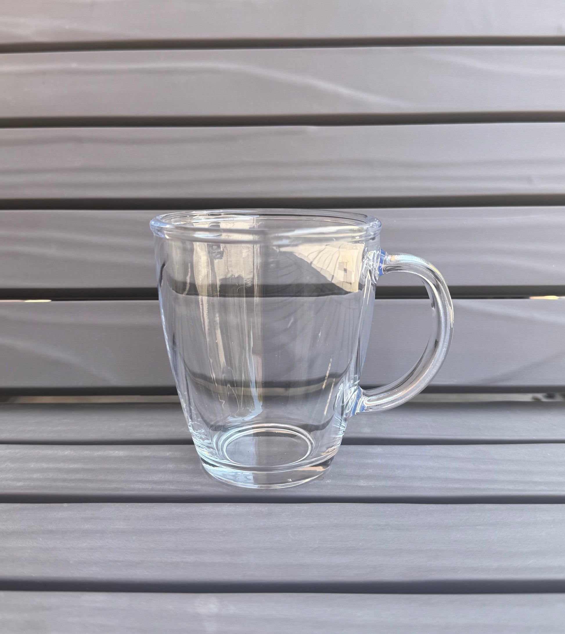 This is a 12 oz. clear glass mug. For warm and cold beverages.