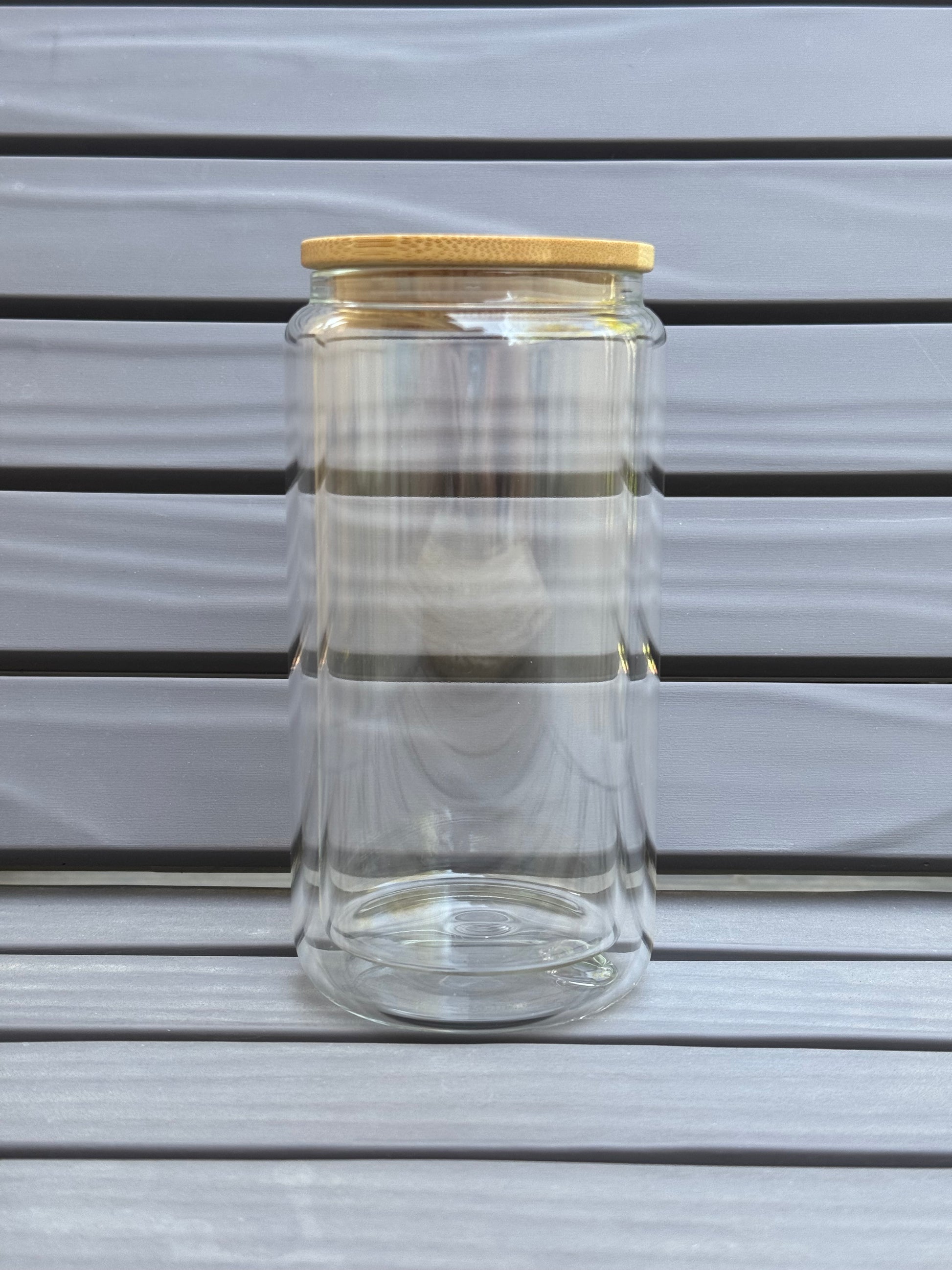 16 oz. glass snowglobe cup, comes with bamboo lid and reusable glass straw.