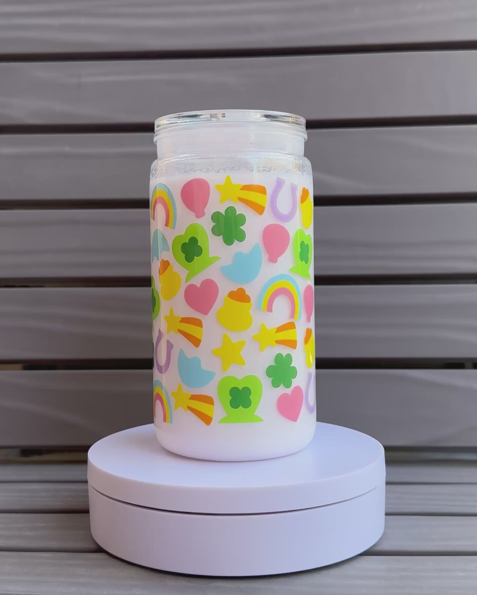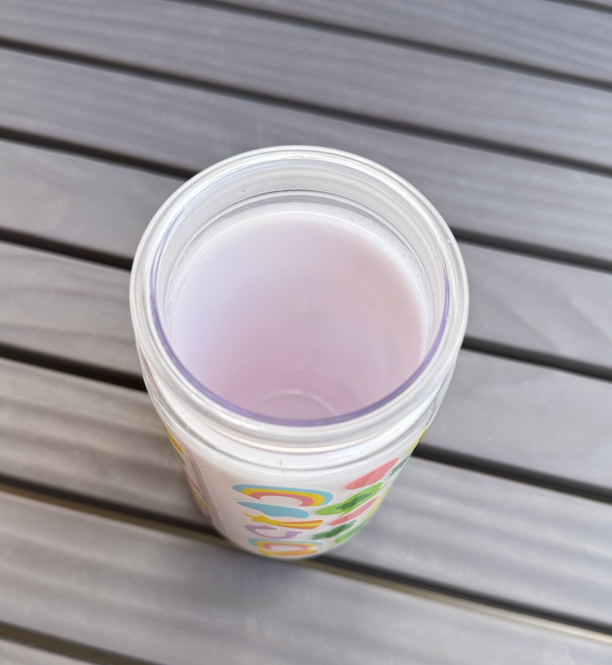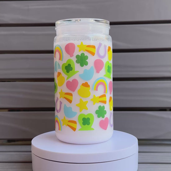 This 20 oz. acrylic snowglobe cup resembles a bowl of Lucky Charms with iced creamy milk. It includes a clear lid and reusable plastic straw.