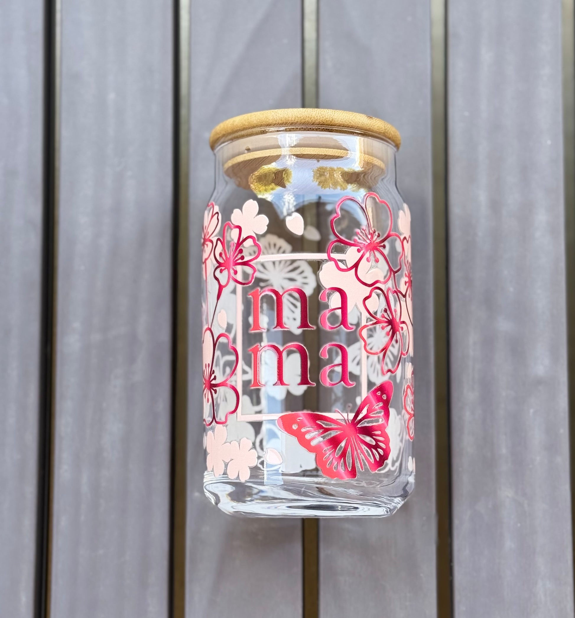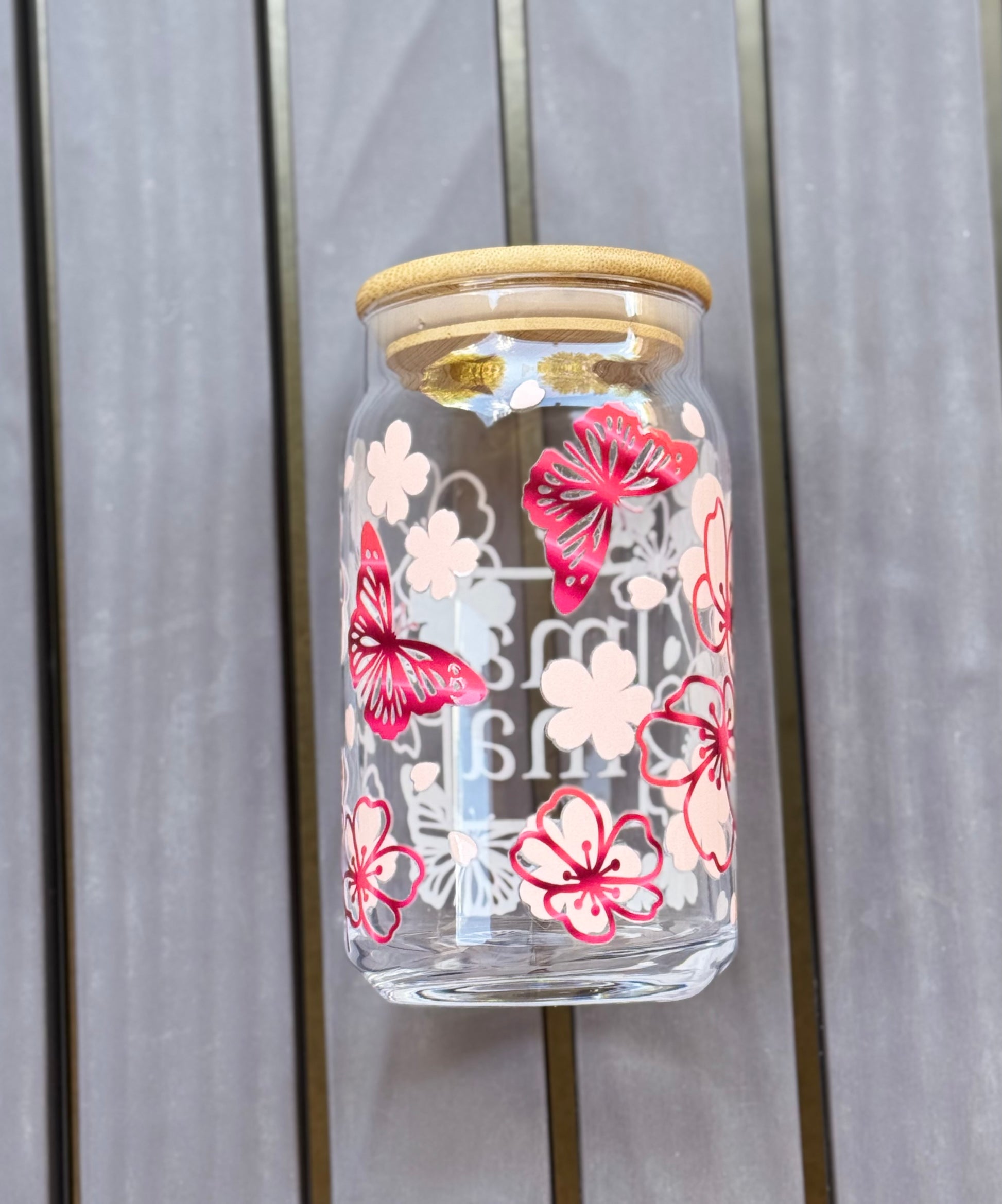 16 oz glass cup, comes with bamboo lid and reusable glass straw.