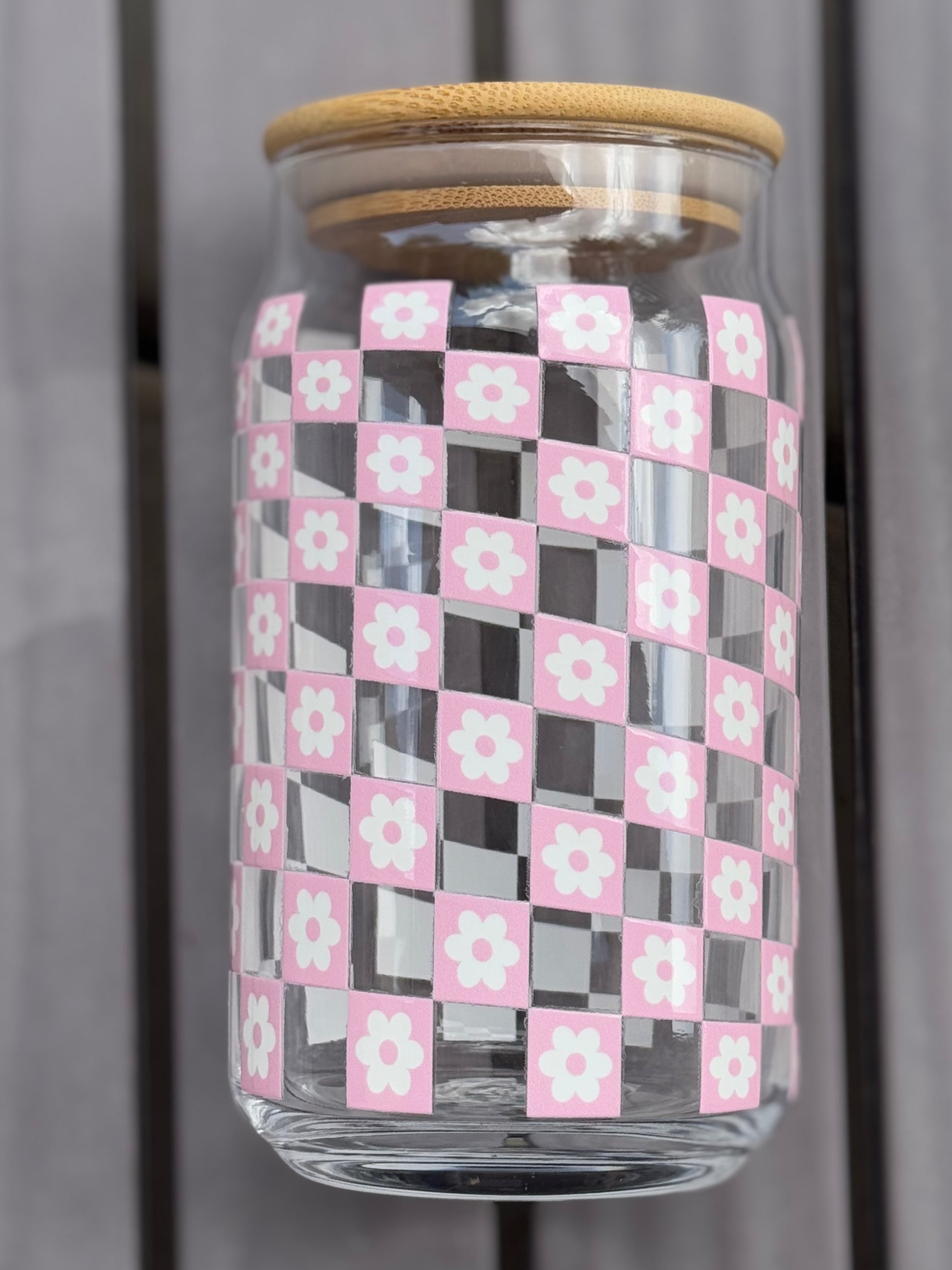 16 oz glass cup, comes with bamboo lid and reusable glass straw.