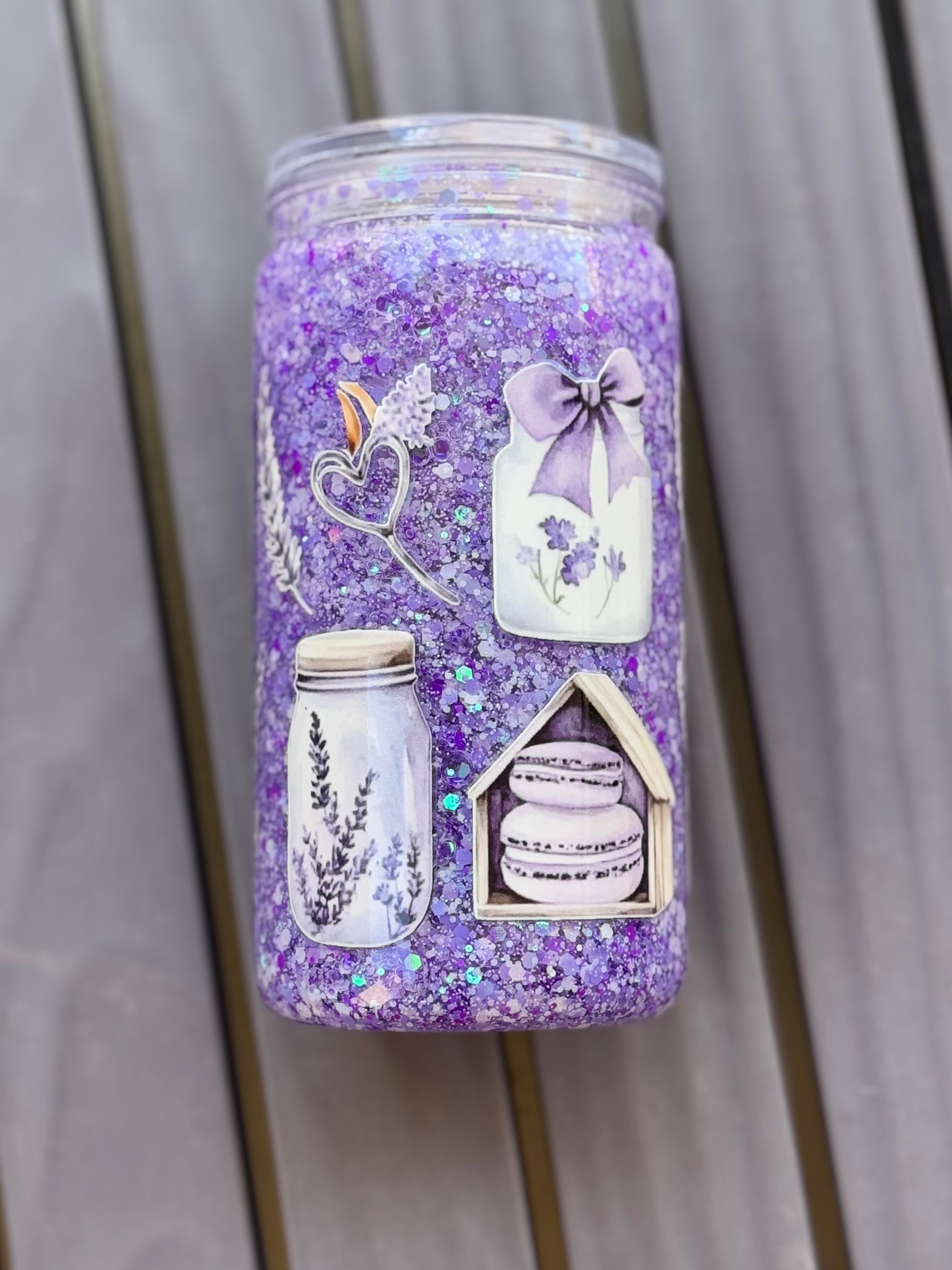 Timeless antique images rest gently within this graceful purple 16 oz. acrylic snowglobe cup. Filled with gorgeous lavender-toned glitter, its slow, soothing swirl creates a mesmerizing dance of vintage charm and quiet beauty.