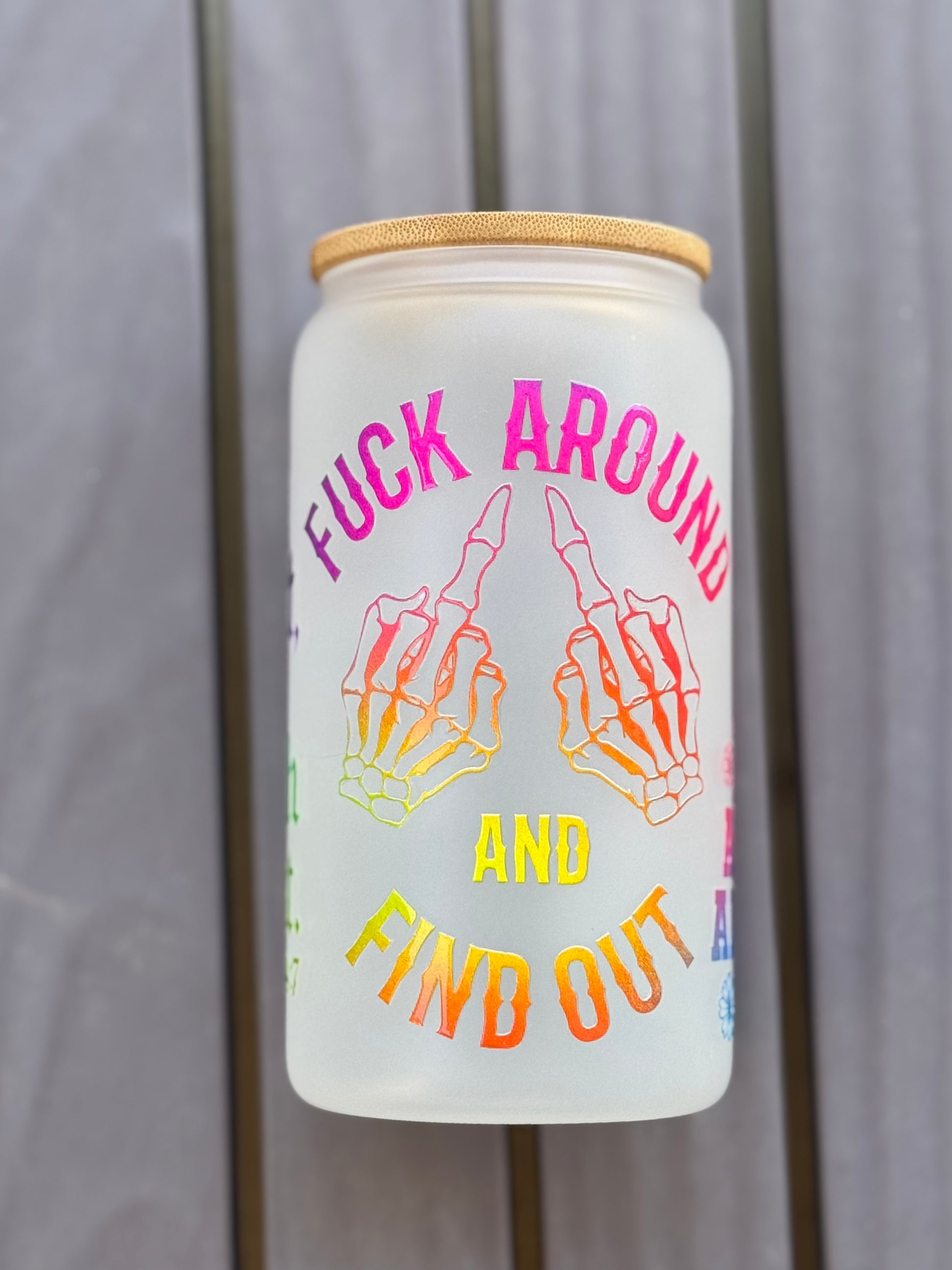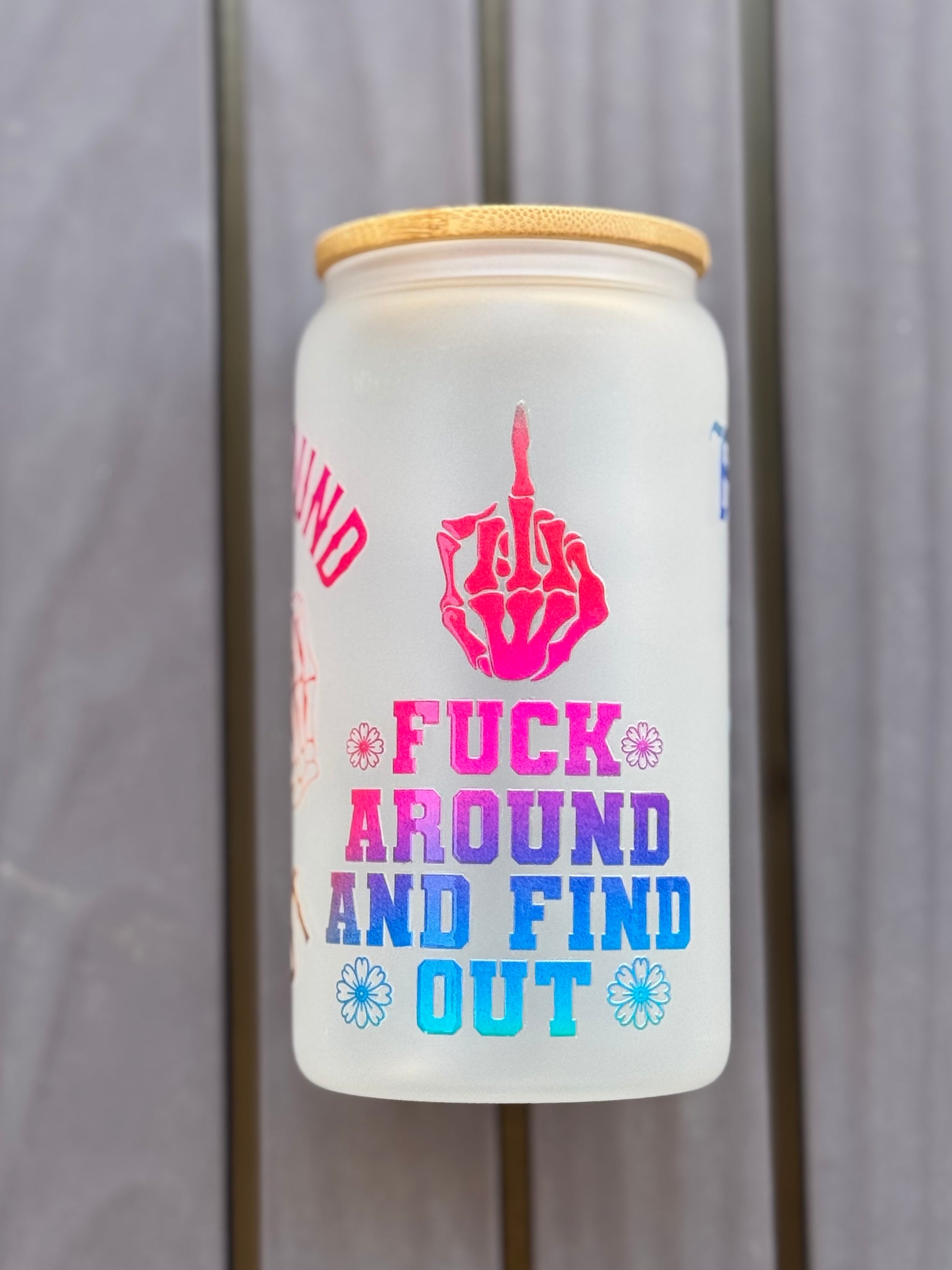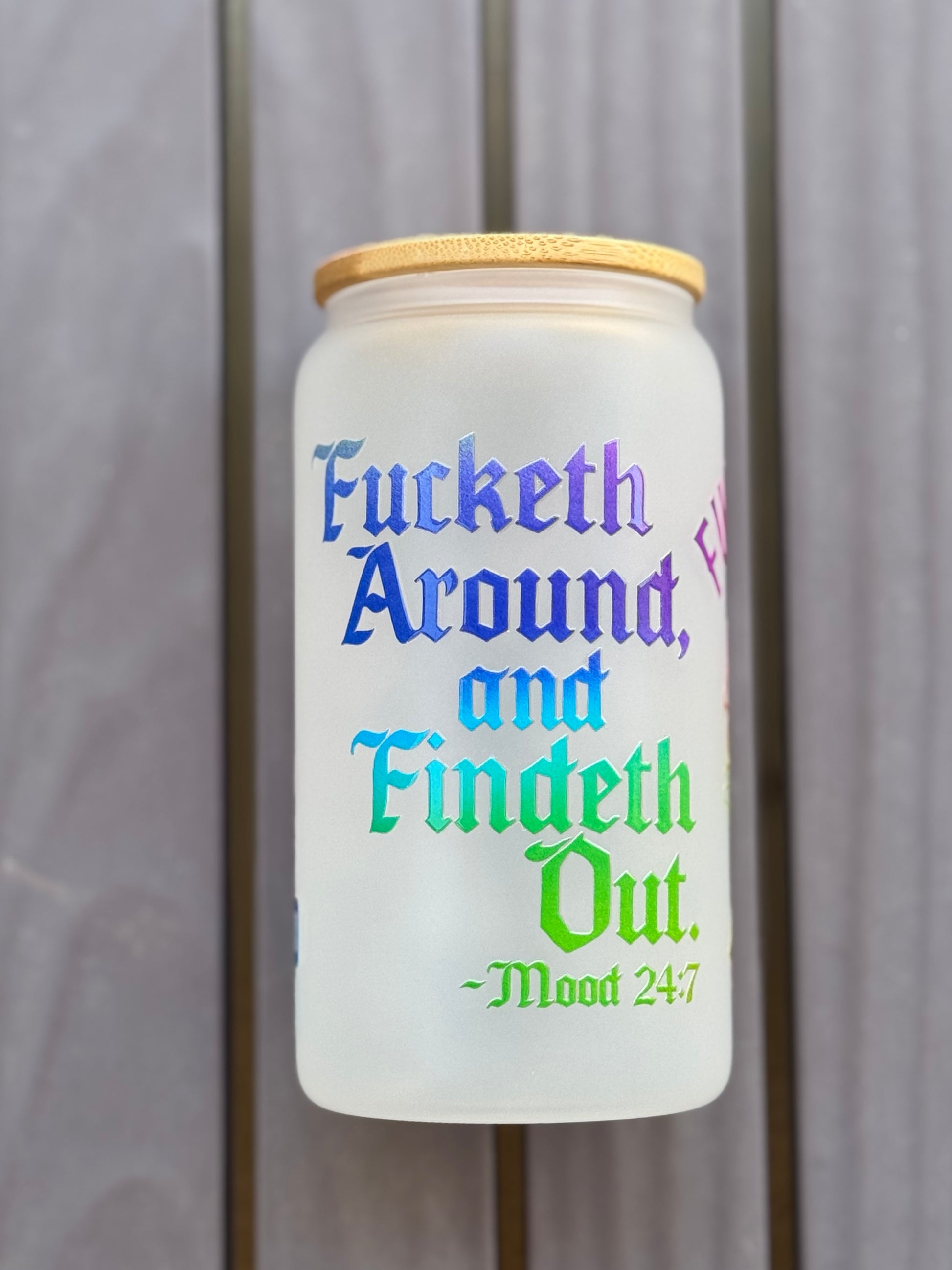 16 oz frosted glass cup, comes with bamboo lid and reusable glass straw.