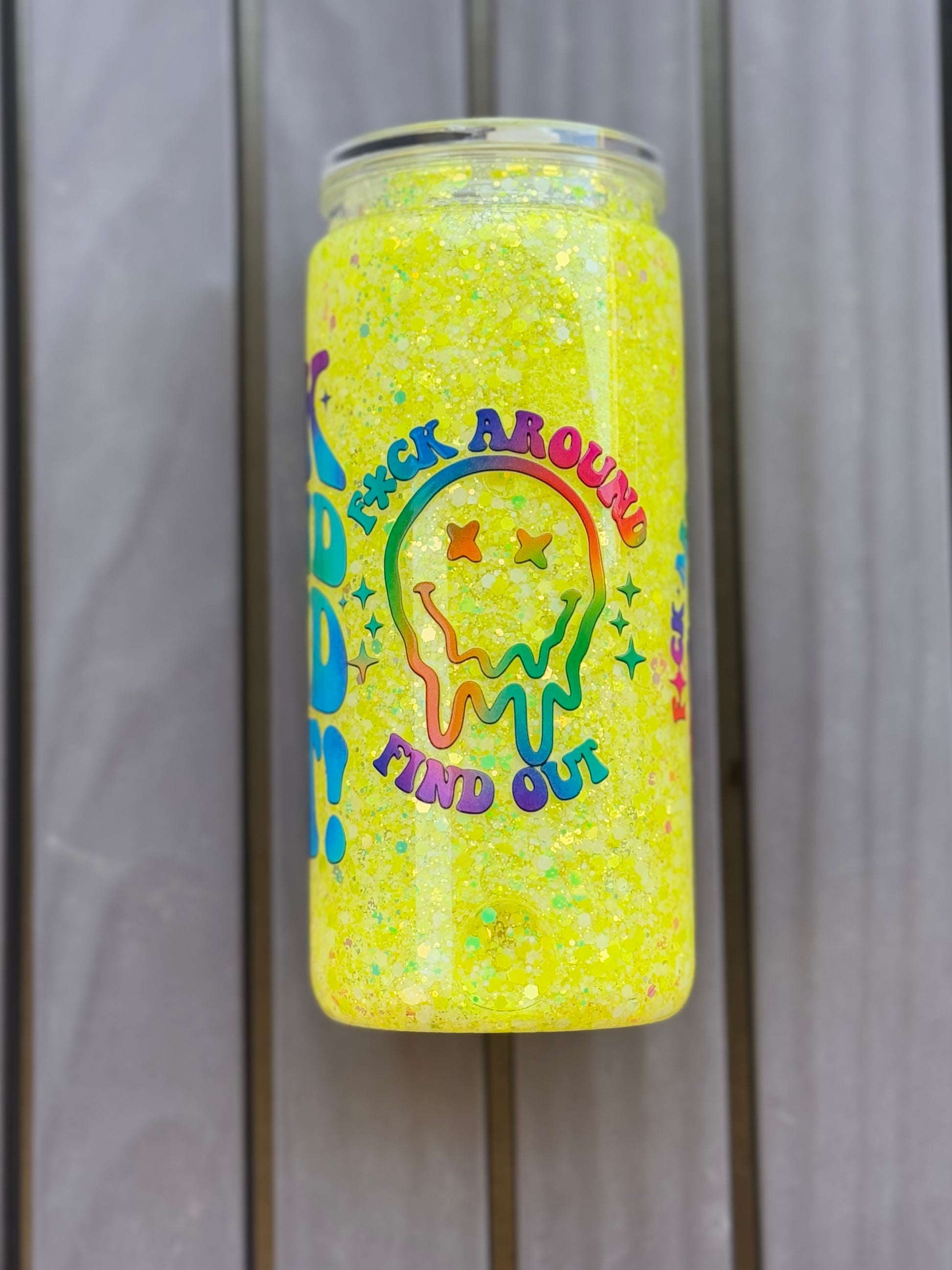 20 oz acrylic snow globe cup with yellow and white glitter, slow flow. Comes with clear plastic lid and plastic straw.
